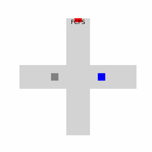 FCFS is a simple scheduling principle: vehicles cross in the order they arrive. If multiple vehicles approach, each waits for the ones ahead (yes, you are supposed to wait if the other person arrives at the stop sign before you) even if their paths don’t conflict.